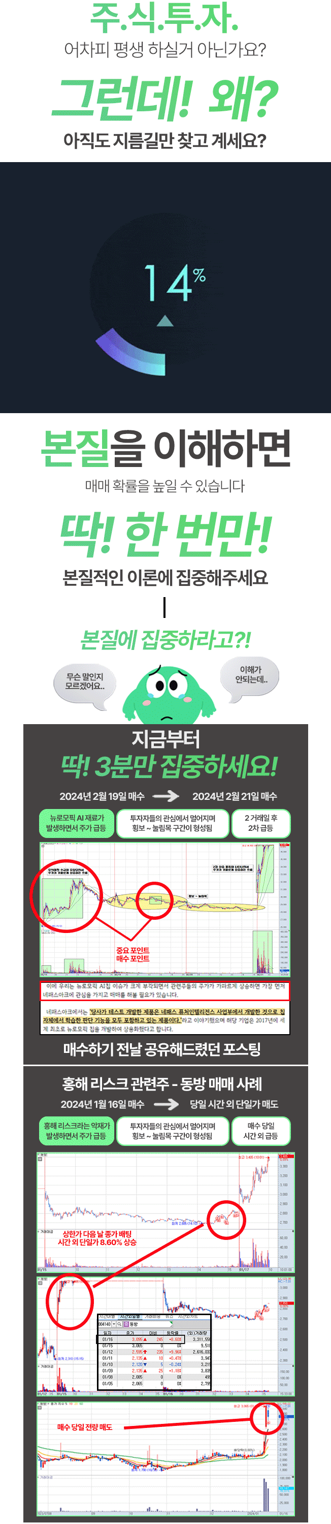 2021년부터 3년 간 운영되었던 단타 매매 가이드북의 추가 업데이트가 완료되었습니다. 단타 매매 가이드북은 맛보기 및 샘플 자료를 제공하지 않으며 가이드북에서 공부할 수 있는 자세한 내용은 상세페이지를 통해 확인하실 수 있습니다.
